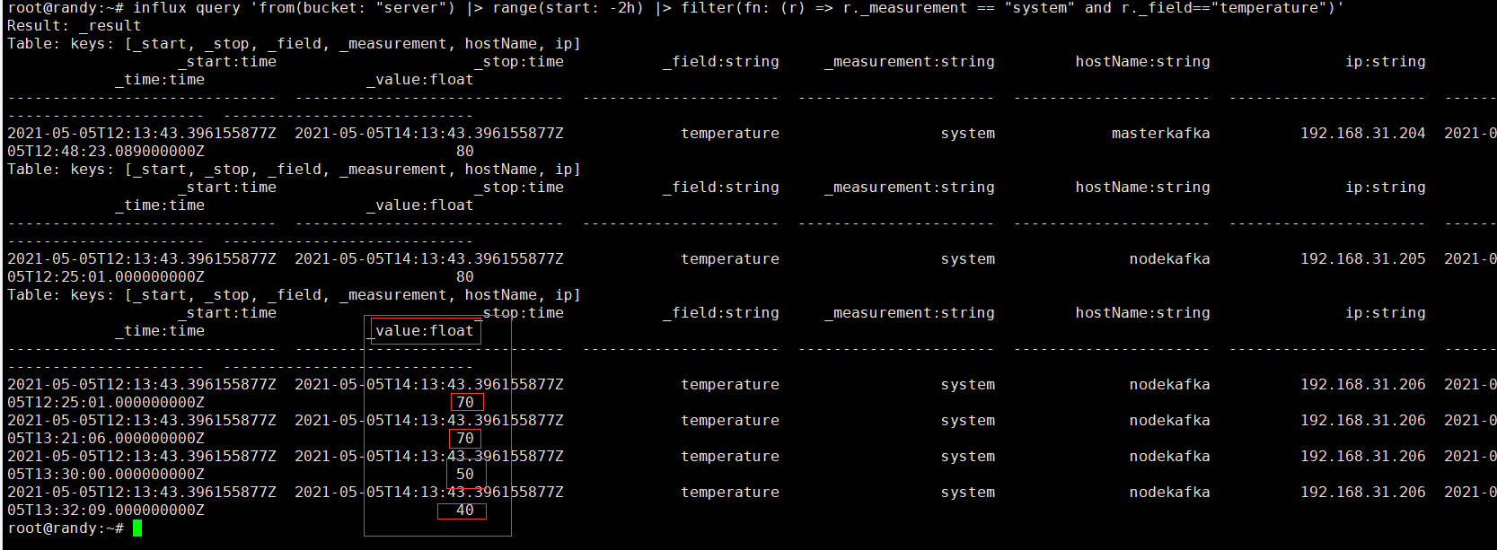influx query 'from(bucket: "server") |> range(start: -2h) |> filter(fn: (r) => r._measurement == "system" and r._field=="temperature")'
